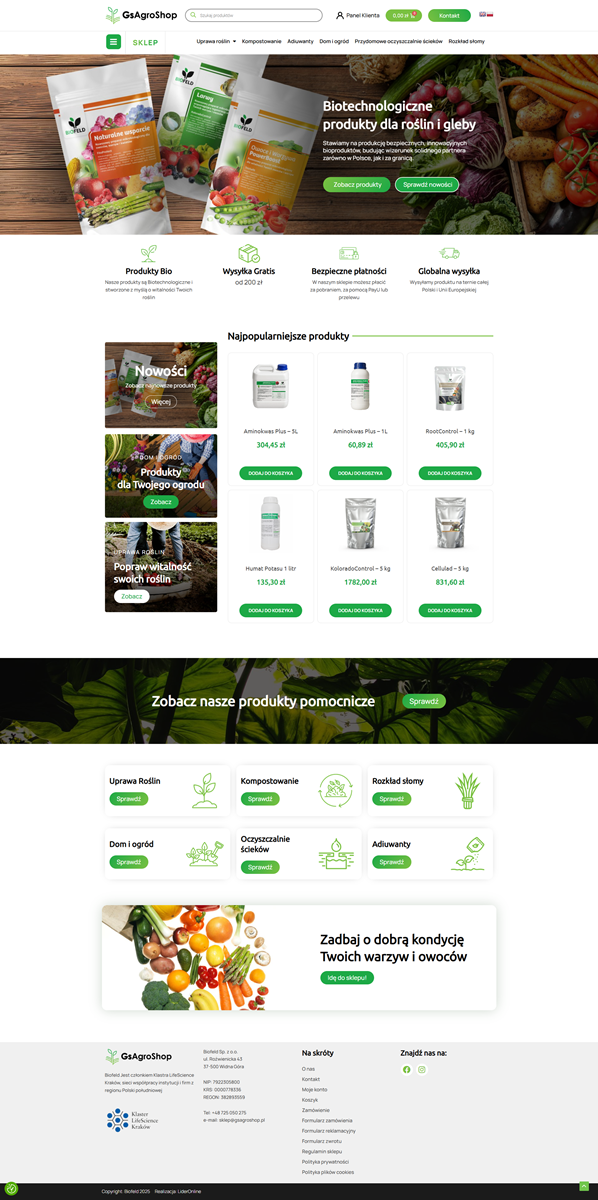 Strona internetowa GsAgroShop – producenta preparatów mikrobiologicznych dla ochrony roślin.